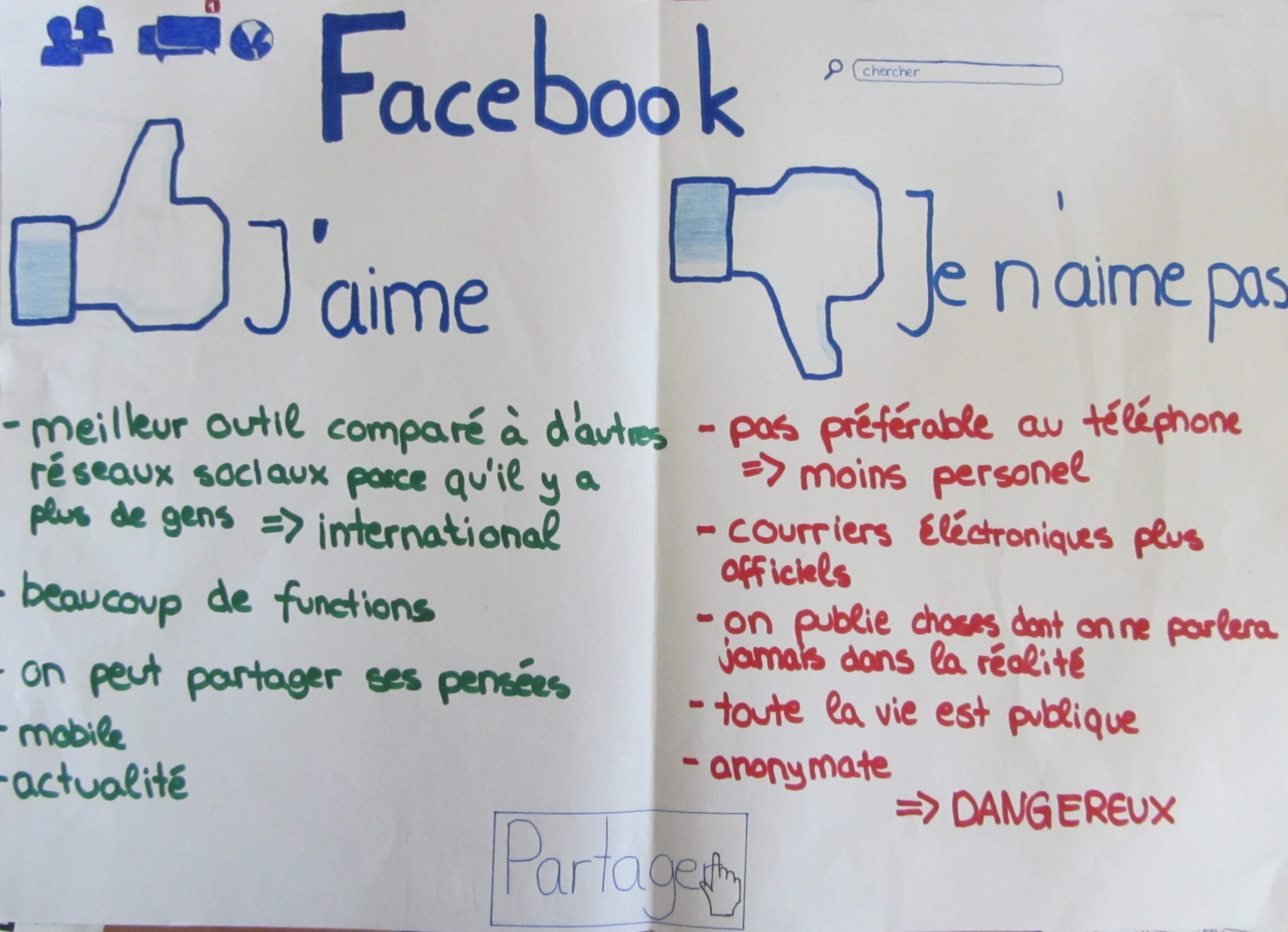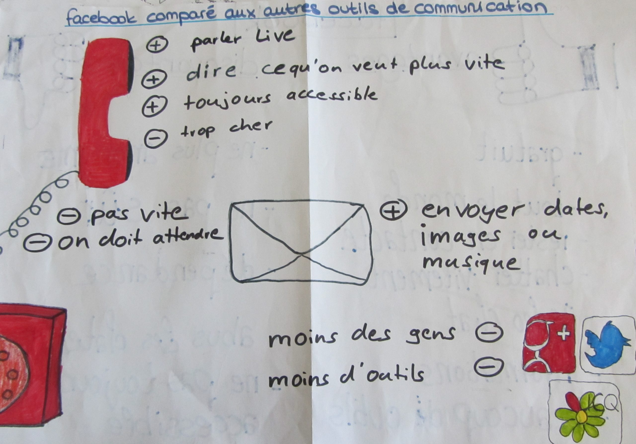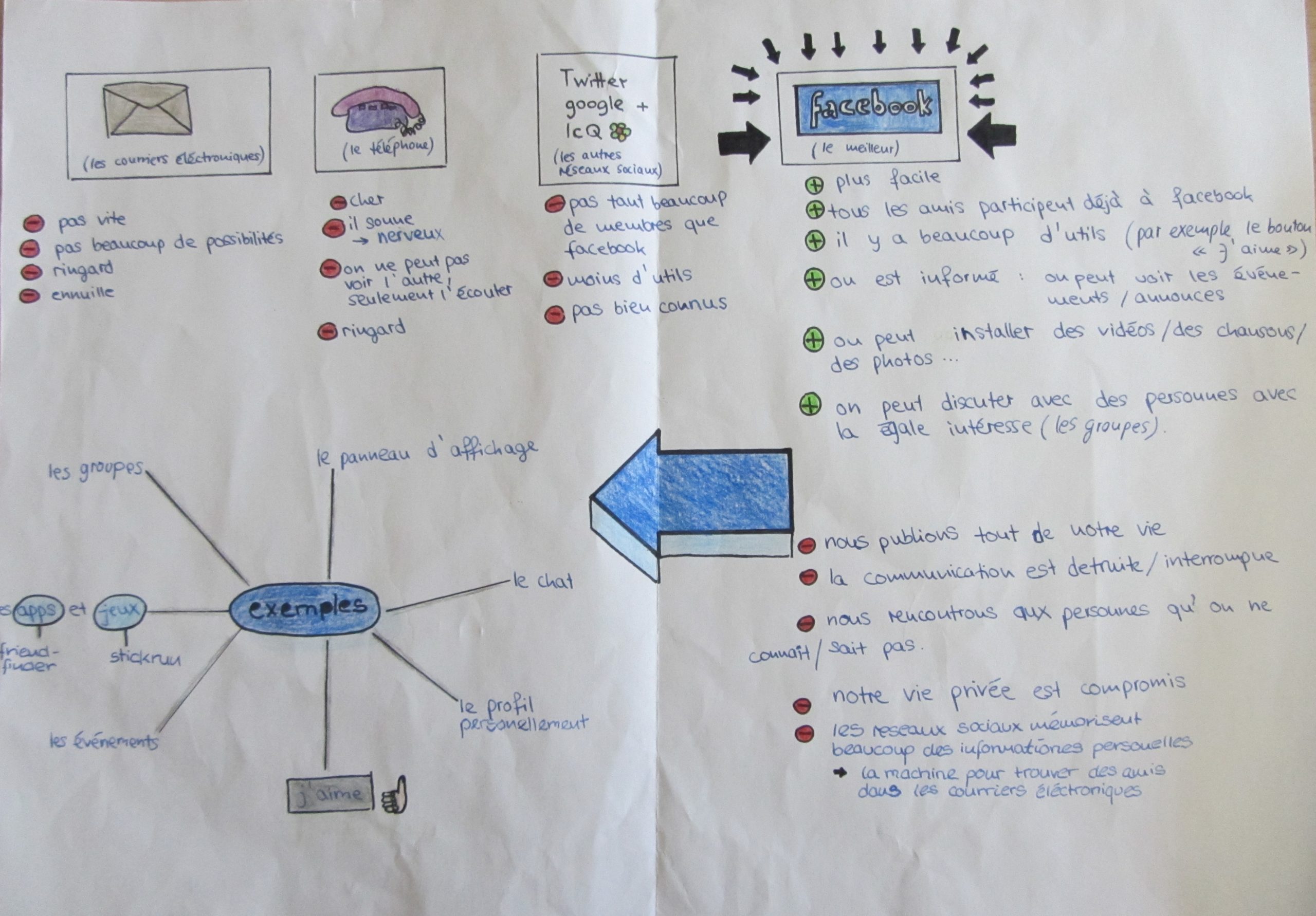 Aus diesen Gründen habe ich in meinen beiden 10. Klassen in Französisch nach der Besprechung der eigenen Nutzung des Internets im Unterrichtsgespräch eine Gruppenarbeitsphase angeschlossen, in der meine SchülerInnen erarbeiten sollten, ob Facebook – das hier stellvertretend für soziale Netzwerke steht – nun wirklich im Vergleich zu anderen Kommunikationsmitteln die beste Art der Kommunikation ist. Die Ergebnisse wurden mangels der Möglichkeit, den Computerraum zu bekommen auf „altmodischen“ Papierplakaten festgehalten und im Anschluss fotografiert, um sie auf den Klassenblog zu stellen. In den nächsten Stunden werden die SchülerInnen ihre Produkte dann in einer gut vorbereiteten Präsentation vorstellen.