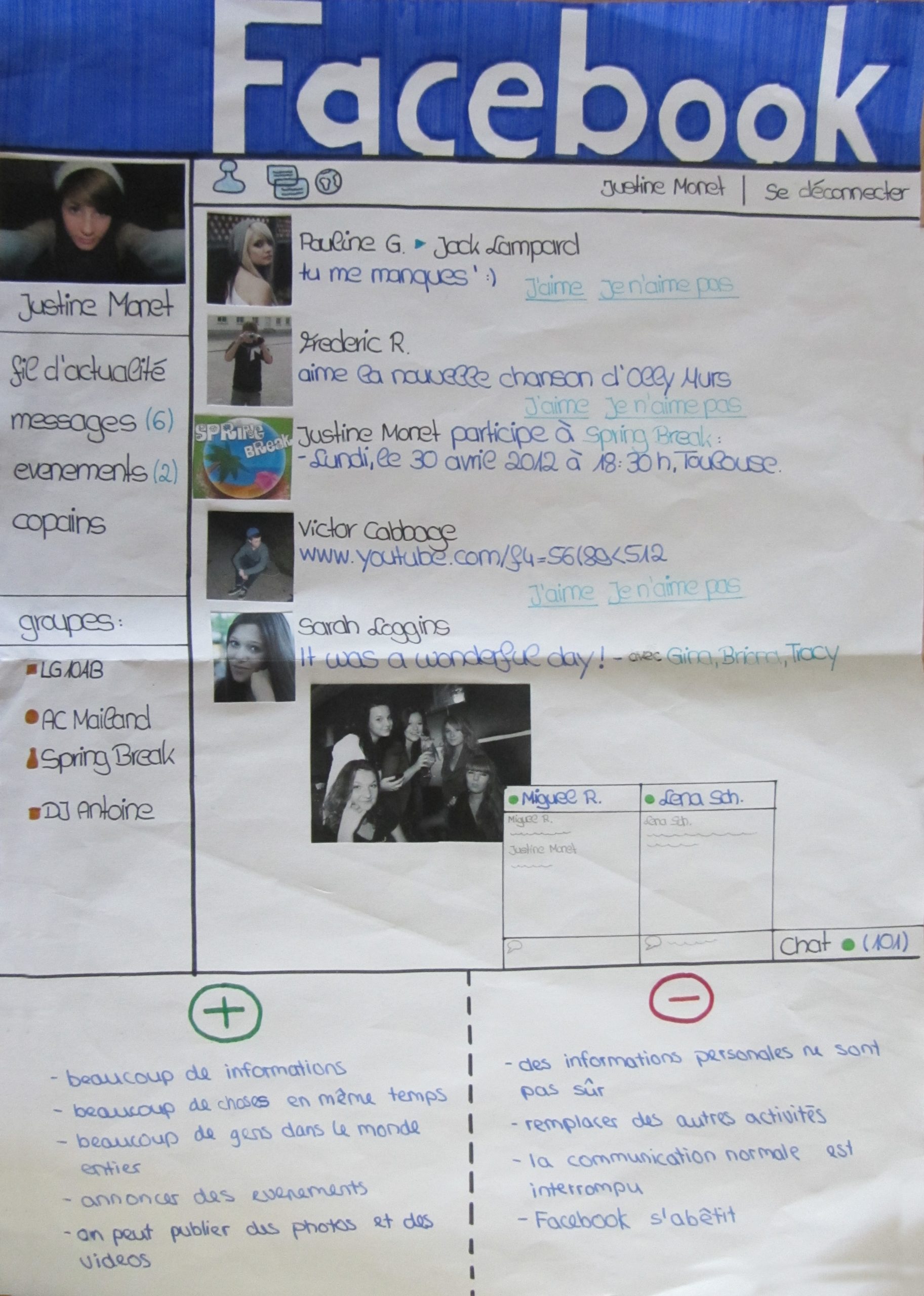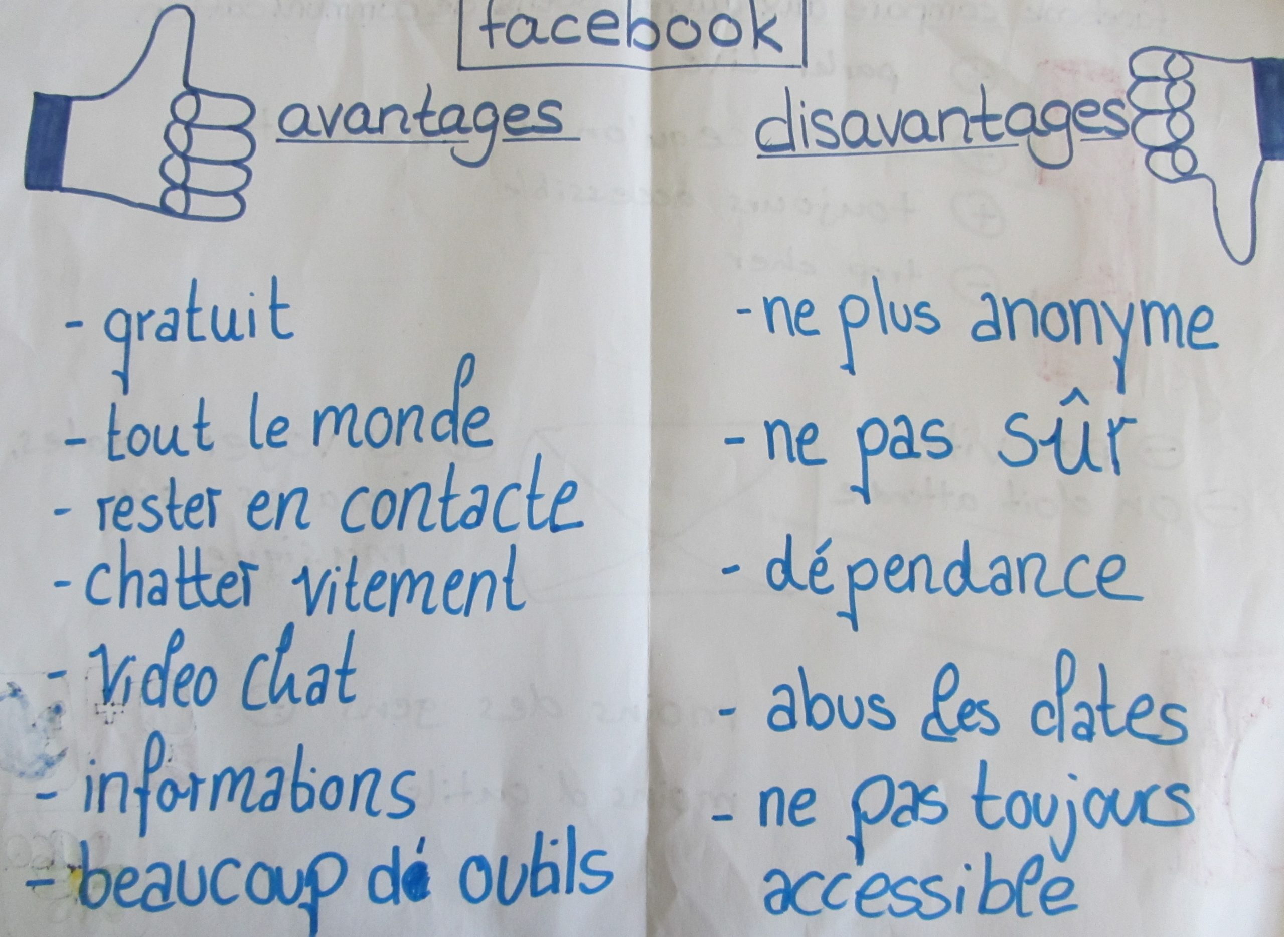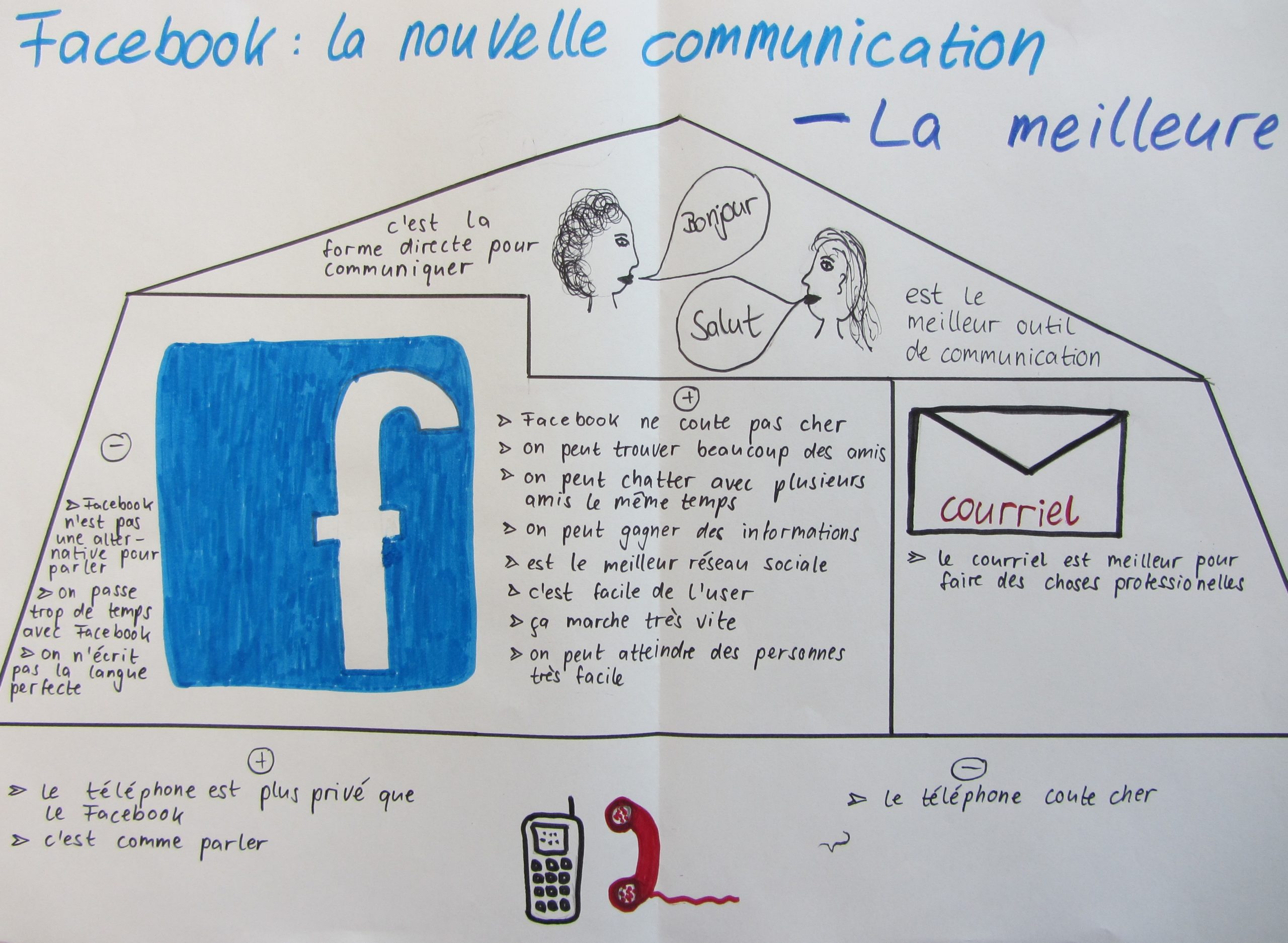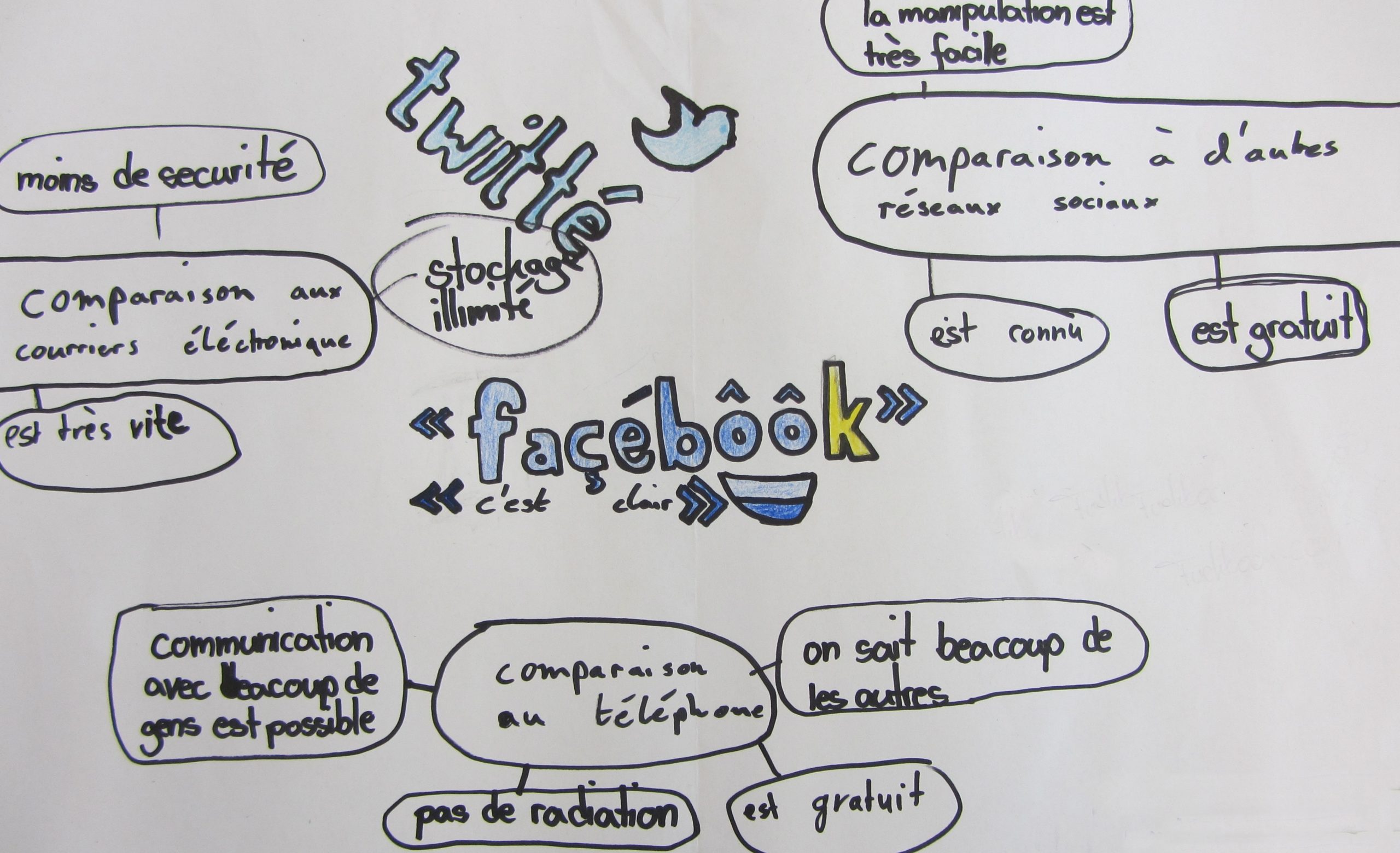Aus diesen Gründen habe ich in meinen beiden 10. Klassen in Französisch nach der Besprechung der eigenen Nutzung des Internets im Unterrichtsgespräch eine Gruppenarbeitsphase angeschlossen, in der meine SchülerInnen erarbeiten sollten, ob Facebook – das hier stellvertretend für soziale Netzwerke steht – nun wirklich im Vergleich zu anderen Kommunikationsmitteln die beste Art der Kommunikation ist. Die Ergebnisse wurden mangels der Möglichkeit, den Computerraum zu bekommen auf „altmodischen“ Papierplakaten festgehalten und im Anschluss fotografiert, um sie auf den Klassenblog zu stellen. In den nächsten Stunden werden die SchülerInnen ihre Produkte dann in einer gut vorbereiteten Präsentation vorstellen.