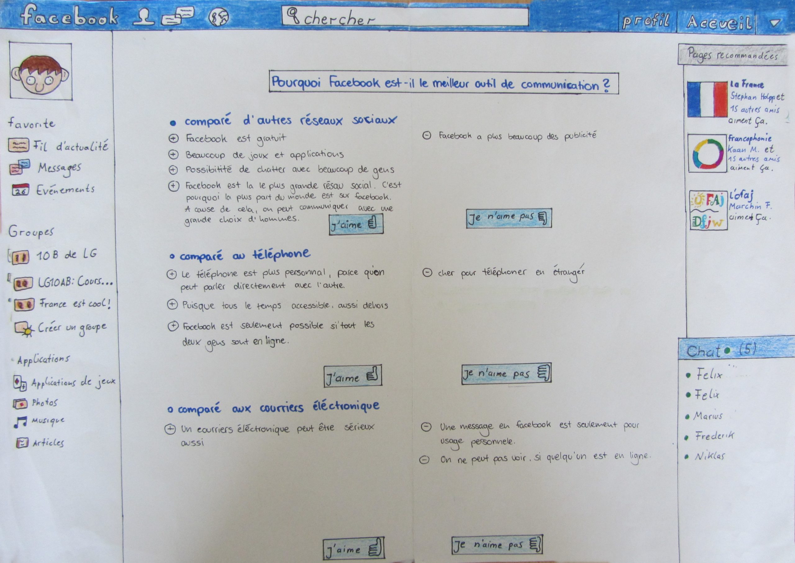 Anmerkung: einige SchülerInnen haben sogar kurzzeitig die Sprache der Benutzeroberfläche ihres Facebookkontos auf Französisch umgestellt, um die Seite richtig zu gestalten. Auch davon sollten sie sprachlich ein wenig profitiert haben, Stichwort „Internetvokabular“.