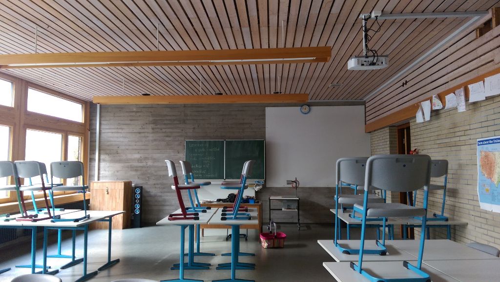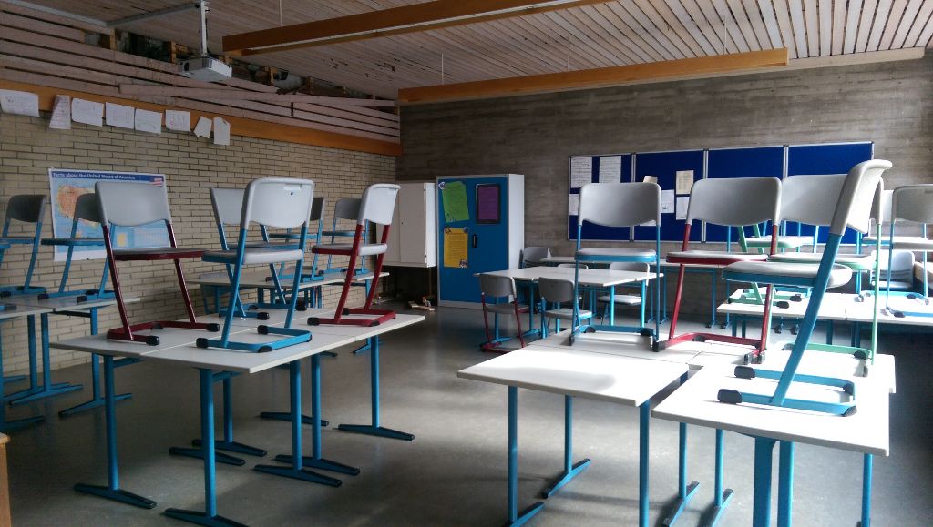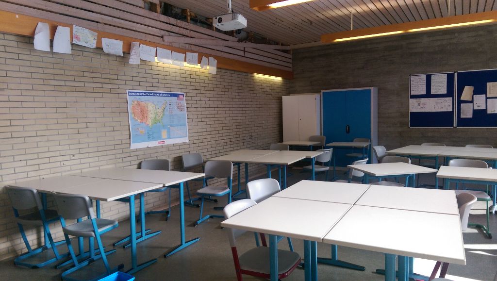 Um es meinen Schüler zu erleichtern, in Gruppen zwischen 3 und 5 Schülern mit den Tablets zu arbeiten, habe ich mich dazu entschlossen, sie in kleinen Lerninseln zu platzieren. D.h. vier oder sechs Einzeltische werden zu je einem Gruppentisch zusammengeschoben. So können die Schüler entweder gemeinsam mit einer App arbeiten indem sie etwas zusammenrücken, oder aber sie können das Tablet in die Mitte legen für den Fall, dass ein Schüler ein Wort nachschlagen möchte. Die Orientierung der Lerninseln habe ich den Schülern überlassen, da sie am besten beurteilen können, wie sie bequem zur Projektionsfläche schauen können.